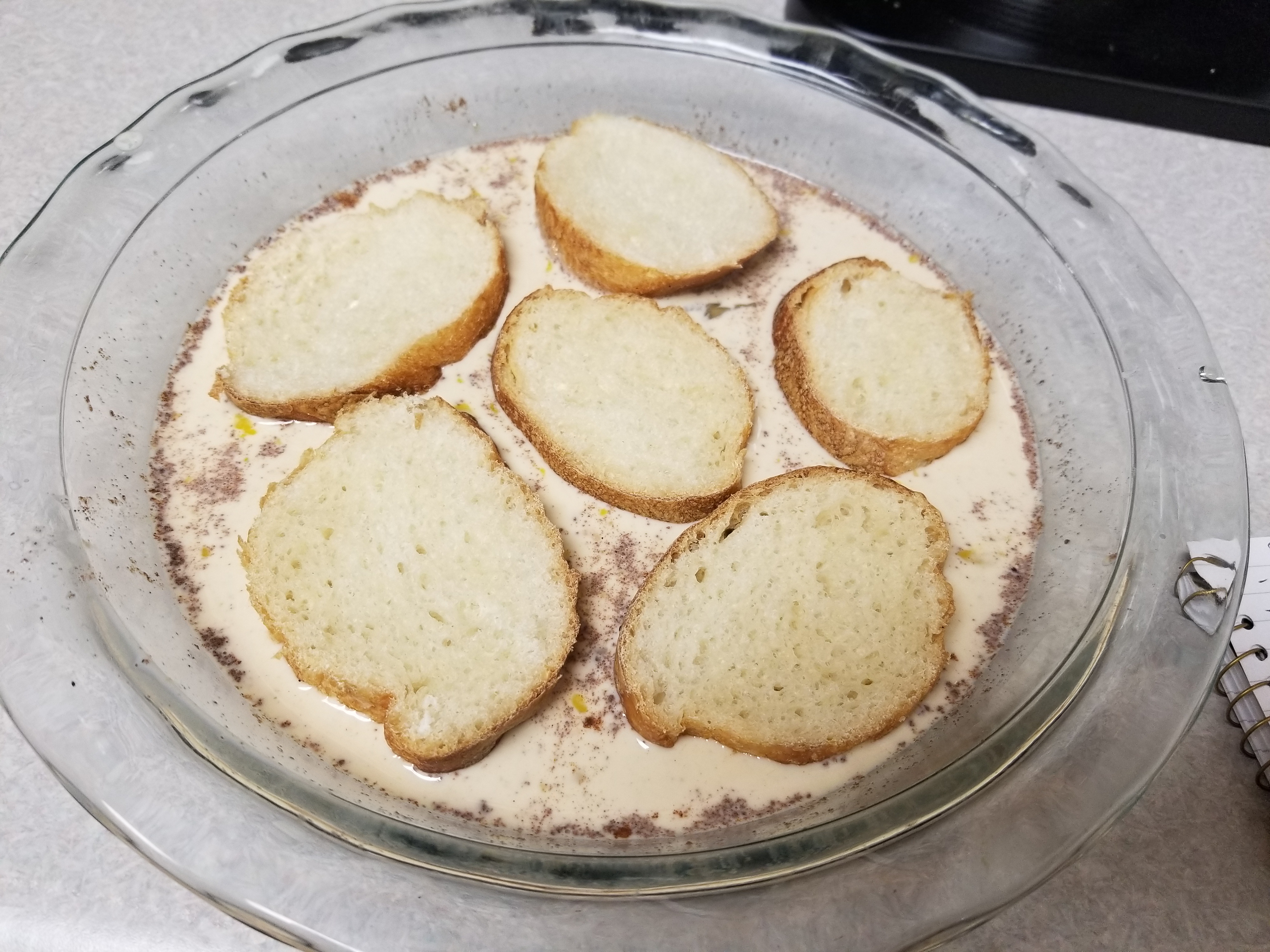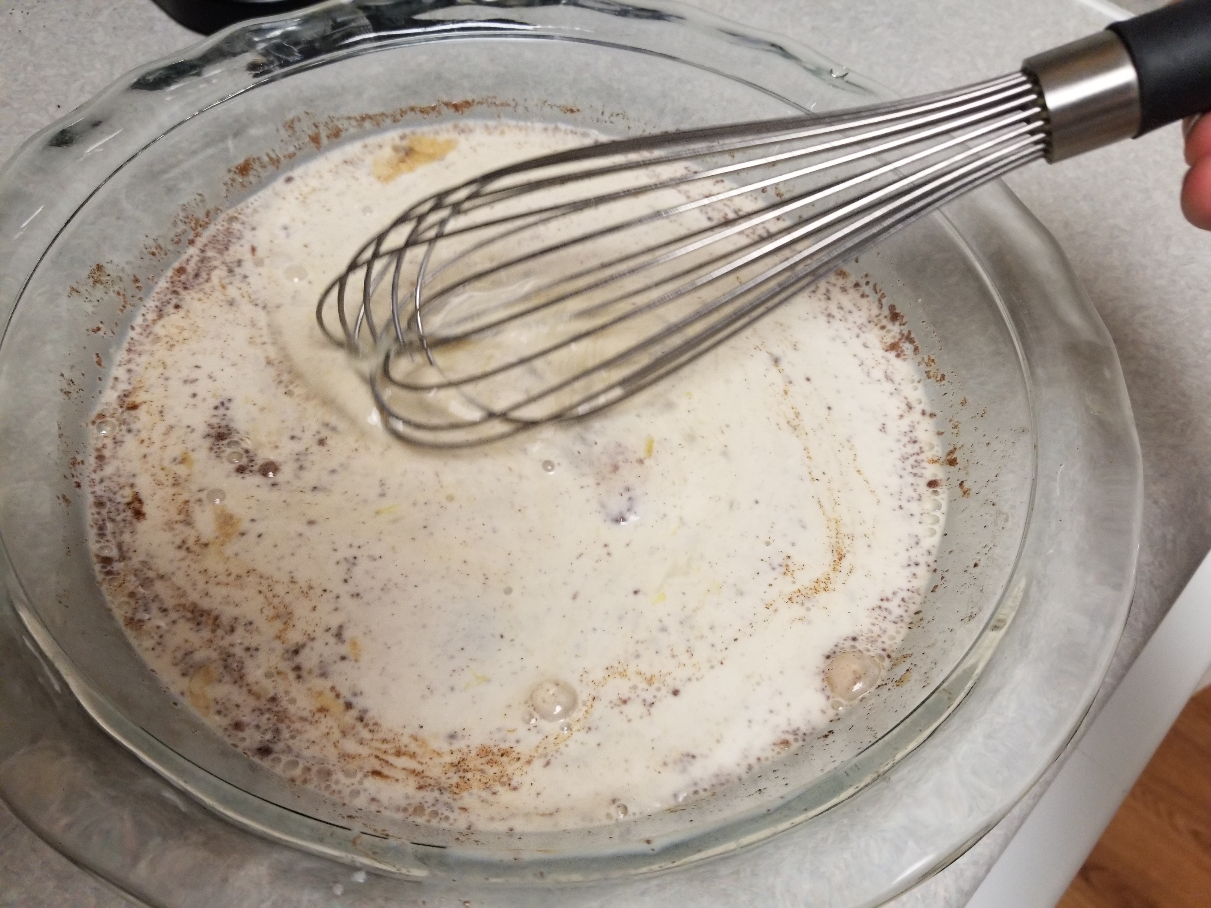 - In a pie dish or casserole dish, combine the eggs, milk, half & half, vanilla, brown sugar, cinnamon, and nutmeg. Whisk it well until it is all combined.