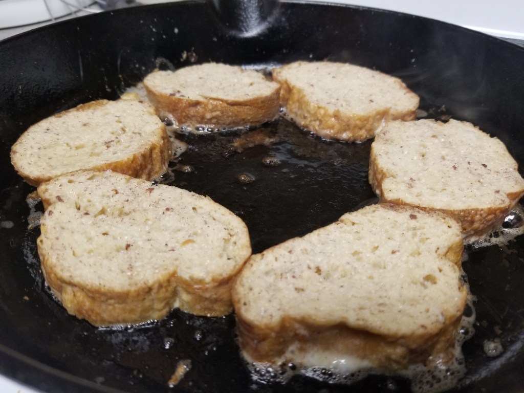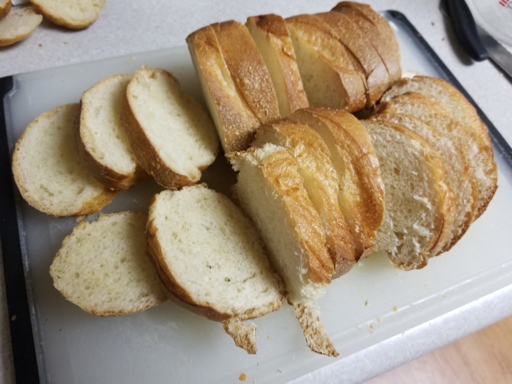 - Cook the slices of French bread in the greased skillet for 2-4 minutes on each side or until they have reached a golden brown.
