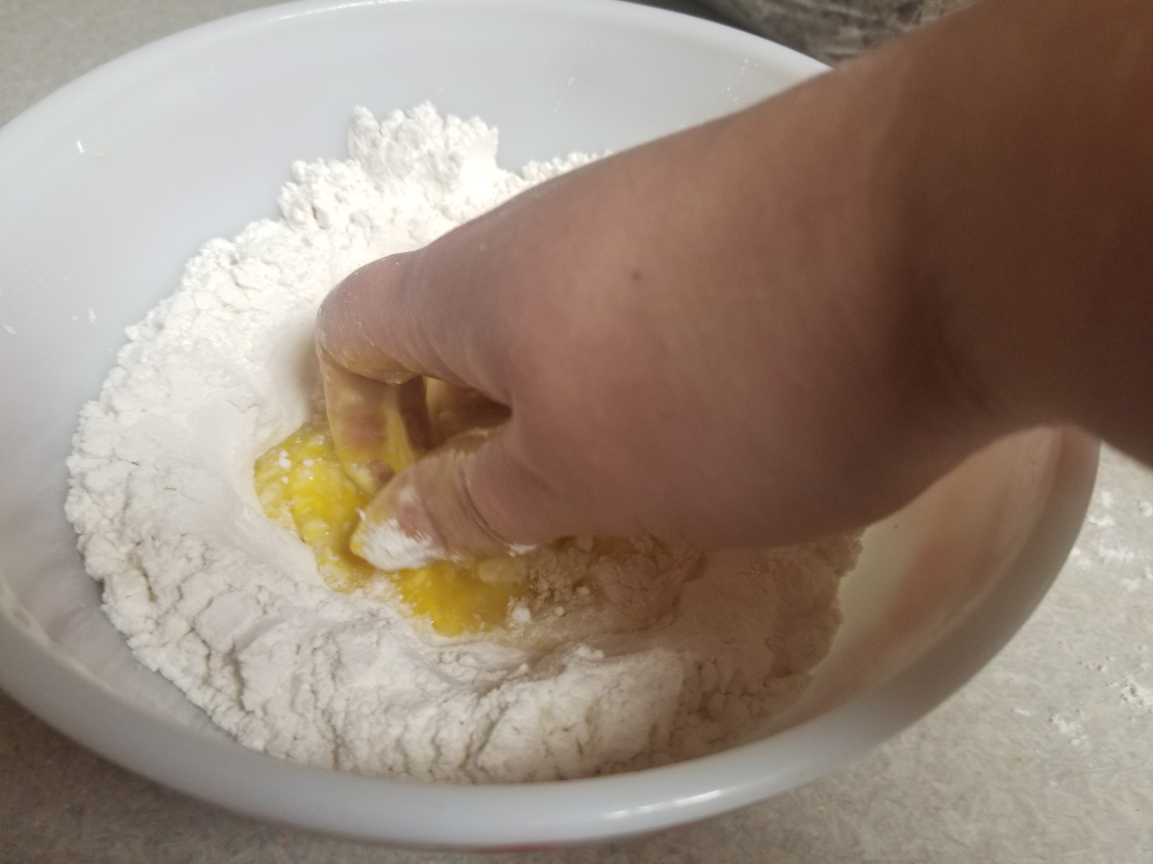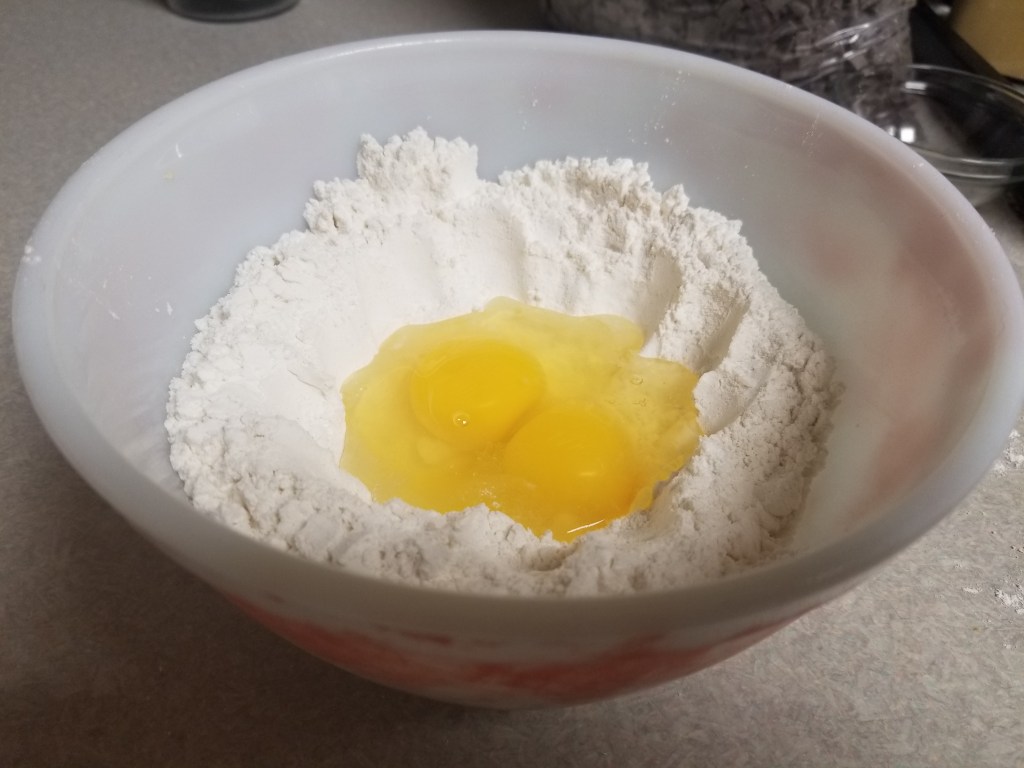 - Pour the flour into a medium sized mixing bowl. Make a divot in the center of the flour. Crack the eggs into the divot.