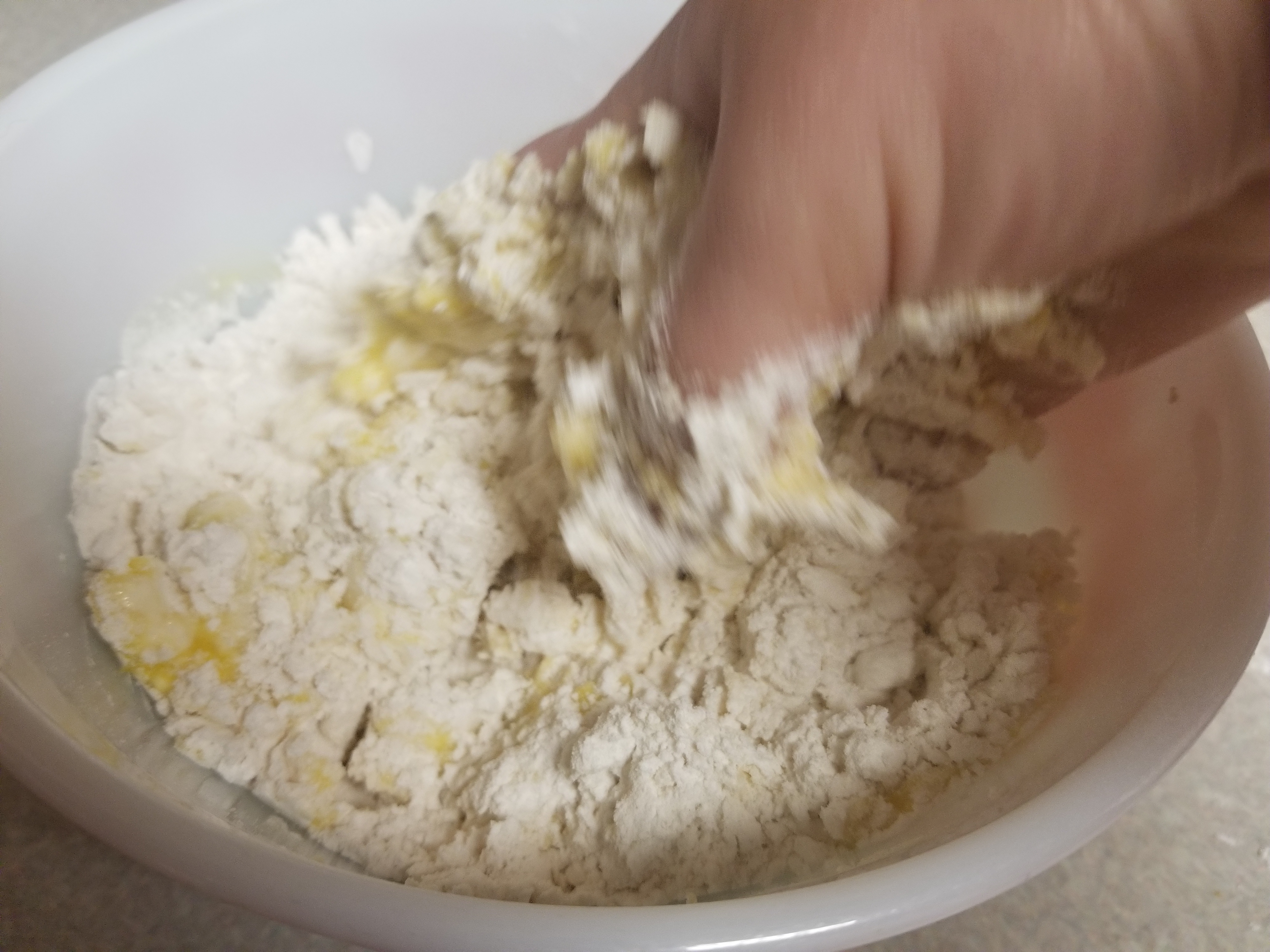 - Mix the eggs with your hand or a spoon. Then incorporate them into the flour about halfway. Add a tsp of olive oil and a tbsp of water and continue to combine until it is still just a little crumbly.