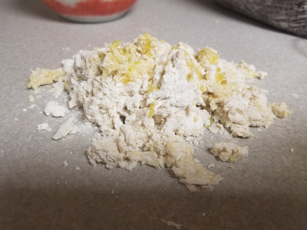Pour the dough on a clean countertop and drizzle another teaspoon of olive oil on top. Incorporate it into the dough with your hands until the dough comes together. If you find the dough is too crumbly still, add a little more olive oil 1/2 teaspoon at a time until the dough ball forms.