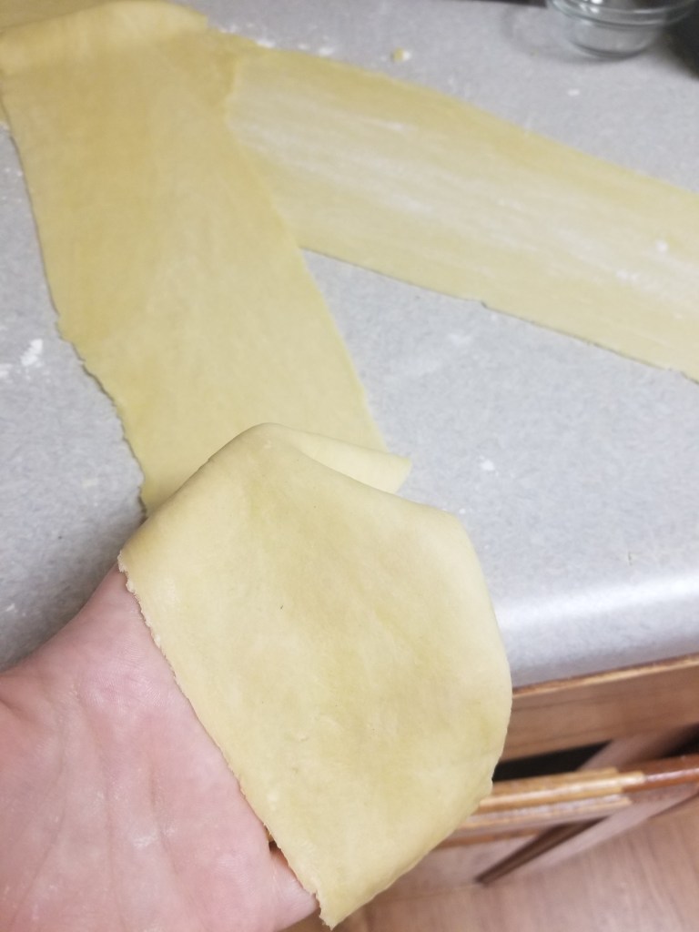 Next, cut the rolled pasta dough into smaller strips and then cut those in half. Or you could cut them into any shape you’d like, get creative!
