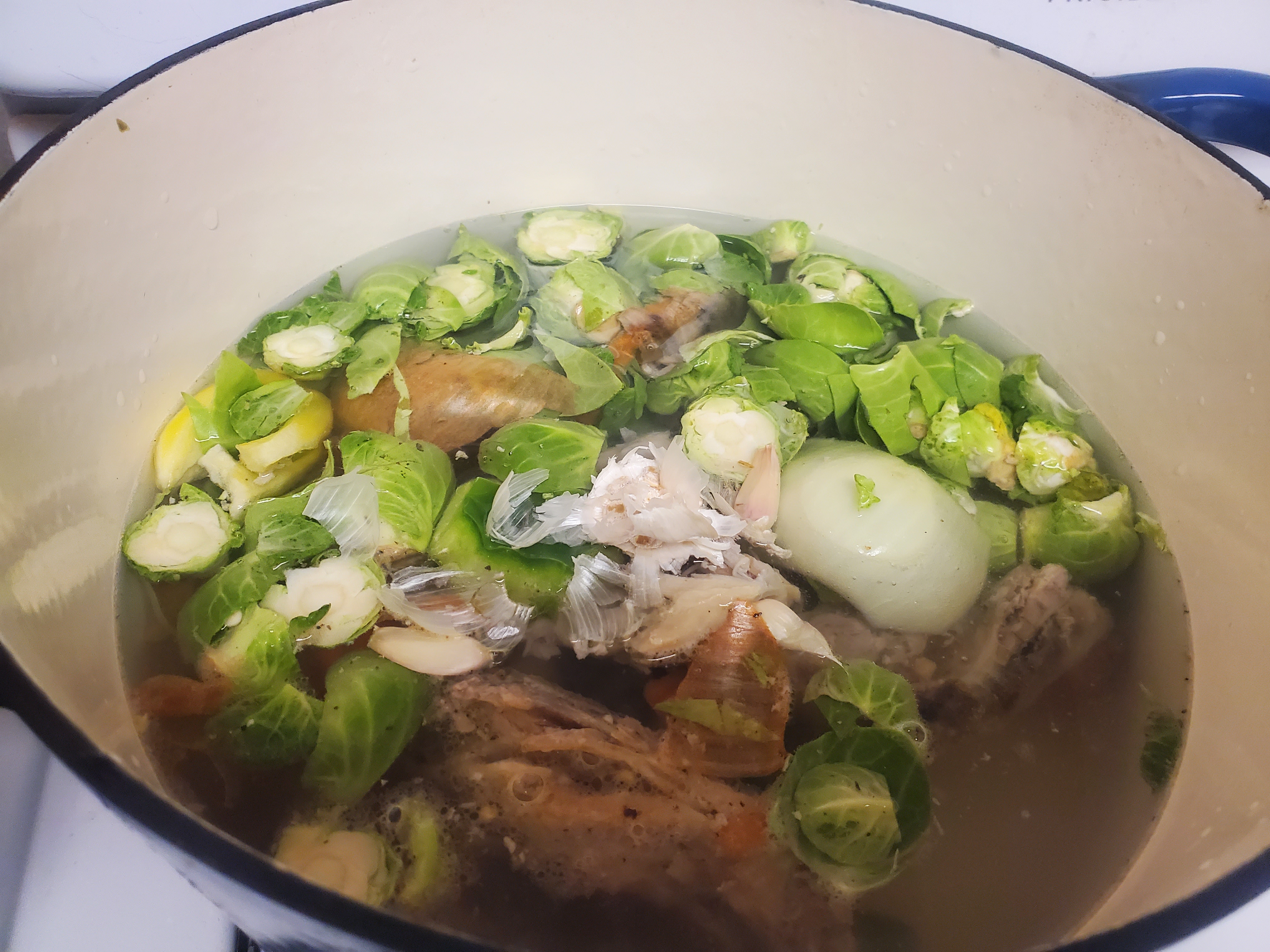 You will add all your bones and veggie scraps to a pot with apple cider vinegar(don’t fret if you don’t have the ACV, just leave it out). As you can see in the photo, my scraps were onion and garlic chunks and peels, brussel sprout pieces, carrot peels and tops, and various chicken and beef bones. Then cover the scraps with water until everything is just covered. You can add more water, but your broth won’t be as gelatinous… it will still be super tasty and nutritious though!