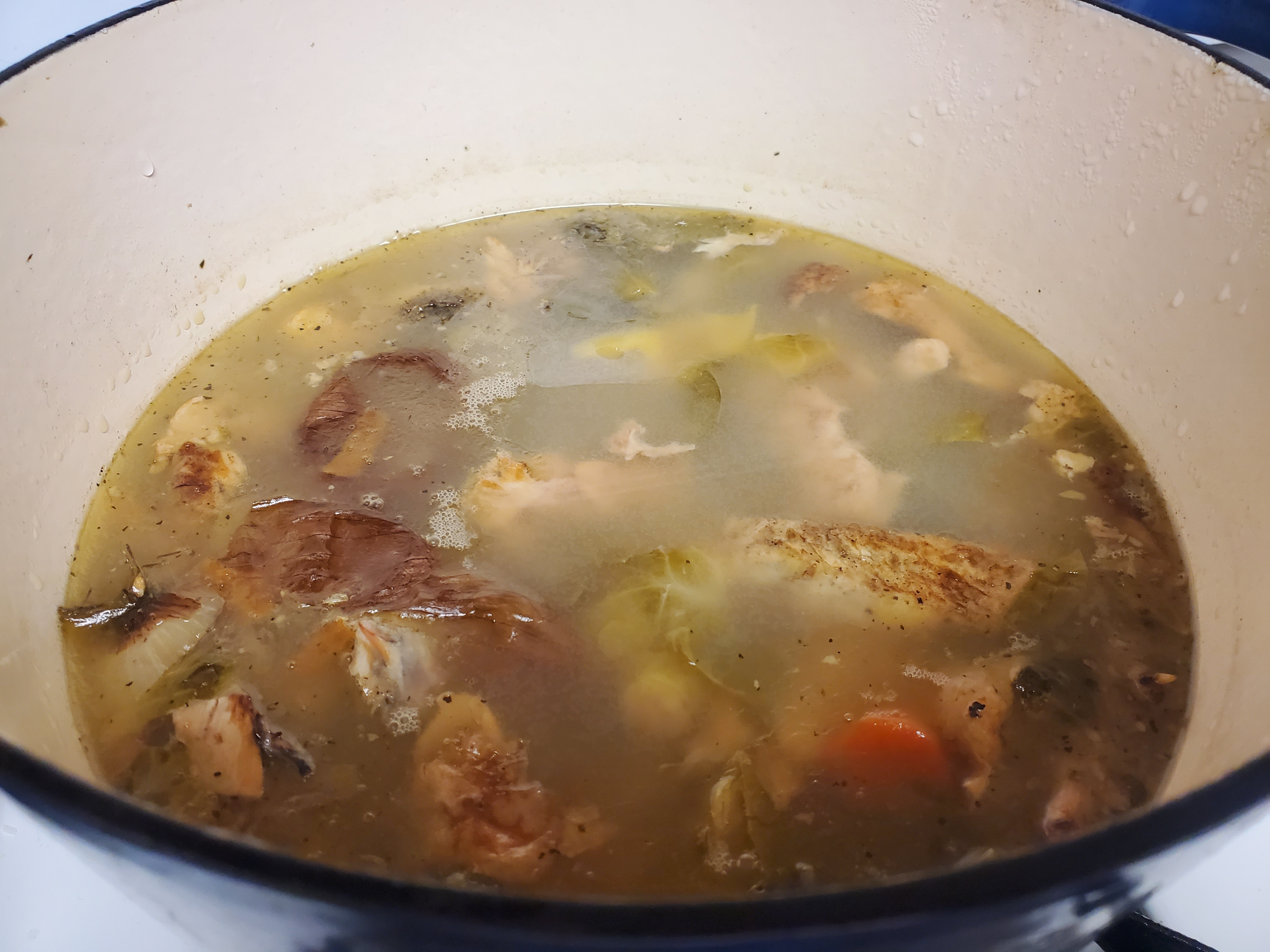Bring the pot to a boil and then reduce to low heat and cover with a lid. I love using my dutch oven for this because it retains the heat so well, but any pot with a lid will get the job done. You want to simmer the broth for as long as you can. The longer it cooks, the more nutrients from the bones you will get. I like to start mine in the morning and then drain it before I go to bed!